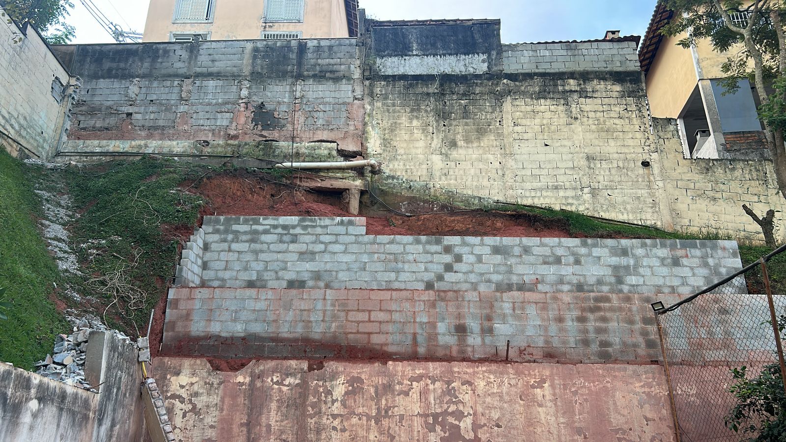 Execução de muro de contenção concluída, estabilizando o terreno e prevenindo novos movimentos de massa