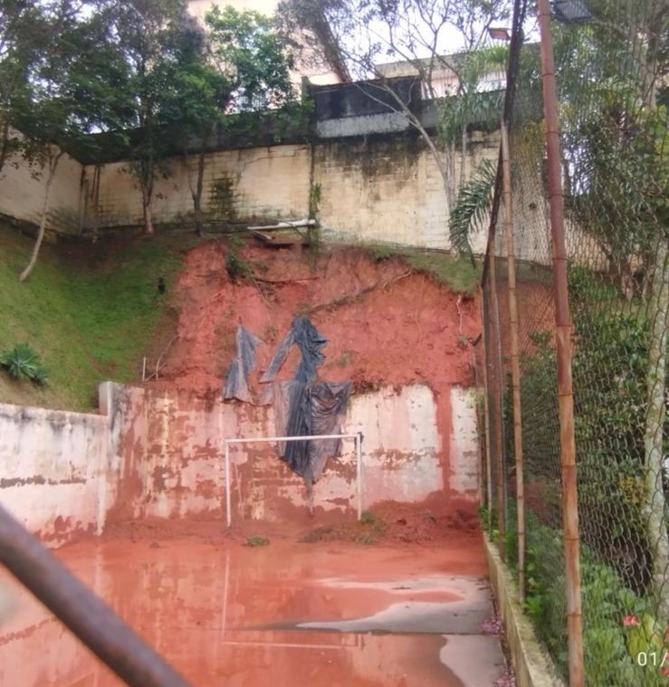 Área com instabilidade de talude e indícios de deslizamento de solo, apresentando risco à integridade estrutural e segurança do entorno